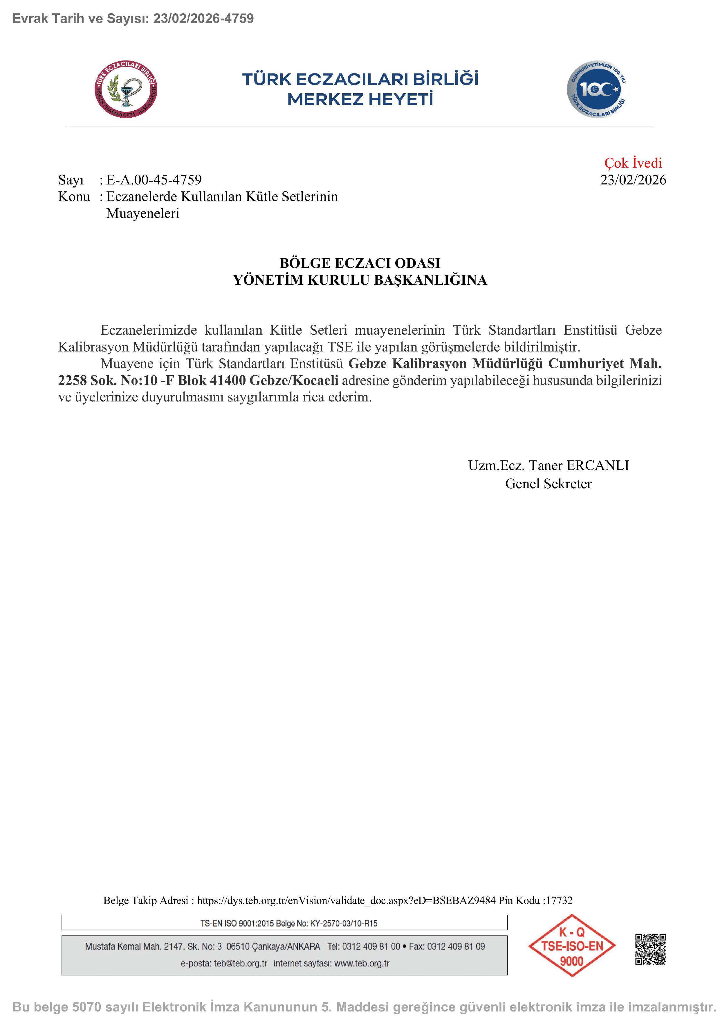 TEB DUYURULARI 24/02/2026 00:00 Eczanelerde Kullanılan Kütle Setlerinin Muayeneleri Hk.