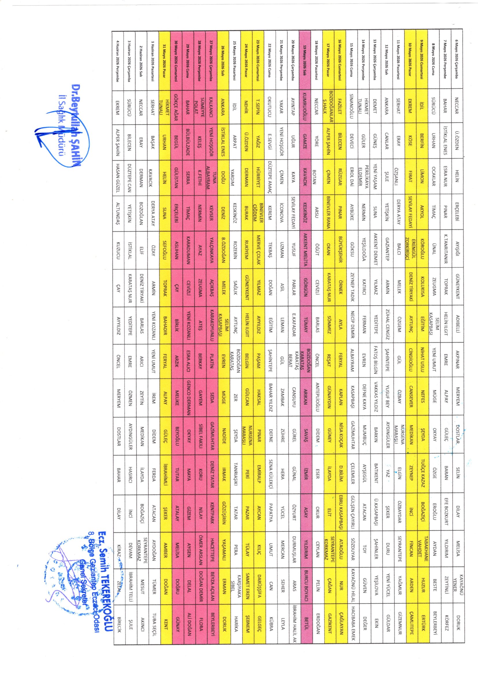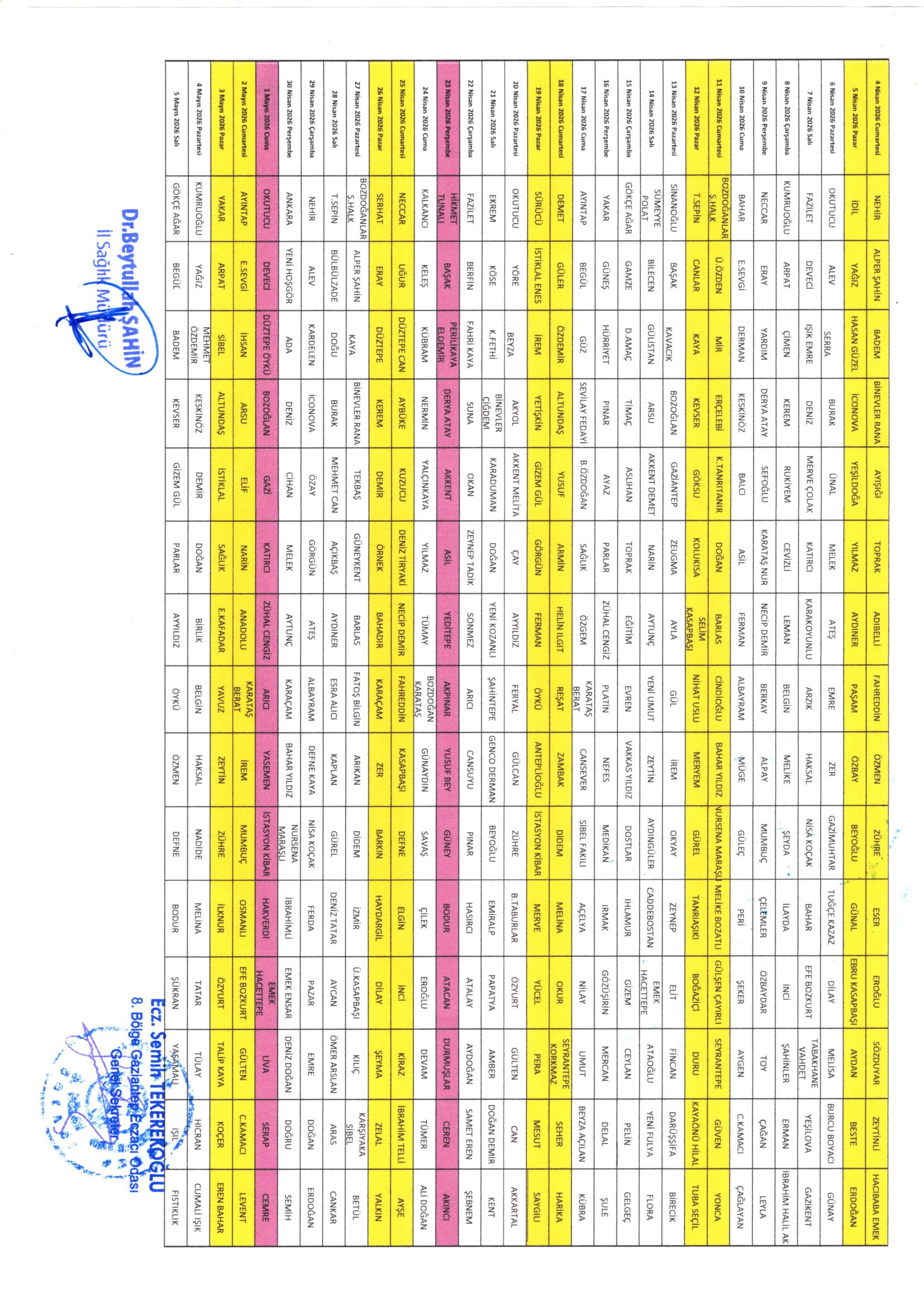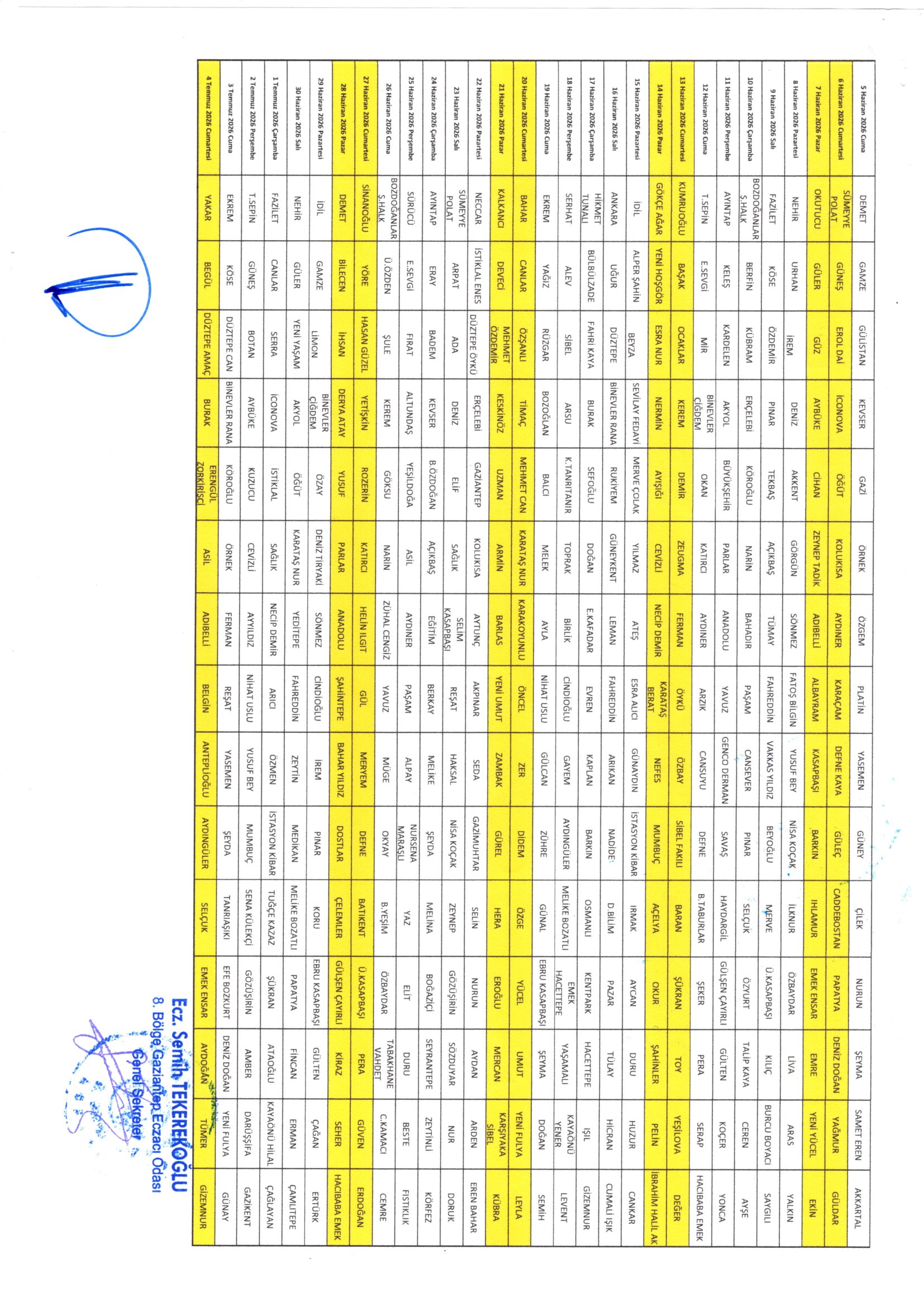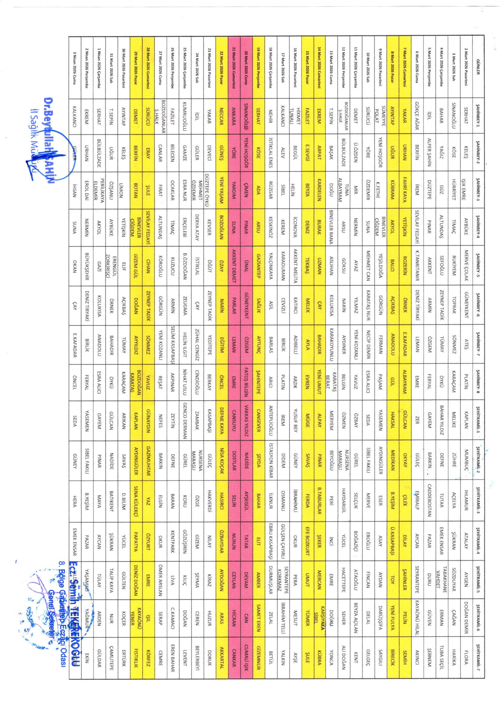 Odamız tarafından hazırlanan ve İl Sağlık Müdürlüğünce onaylanan 02 Mart 2026 – 04 Temmuz 2026 tarihleri arası nöbet listesi ekte yer almaktadır.